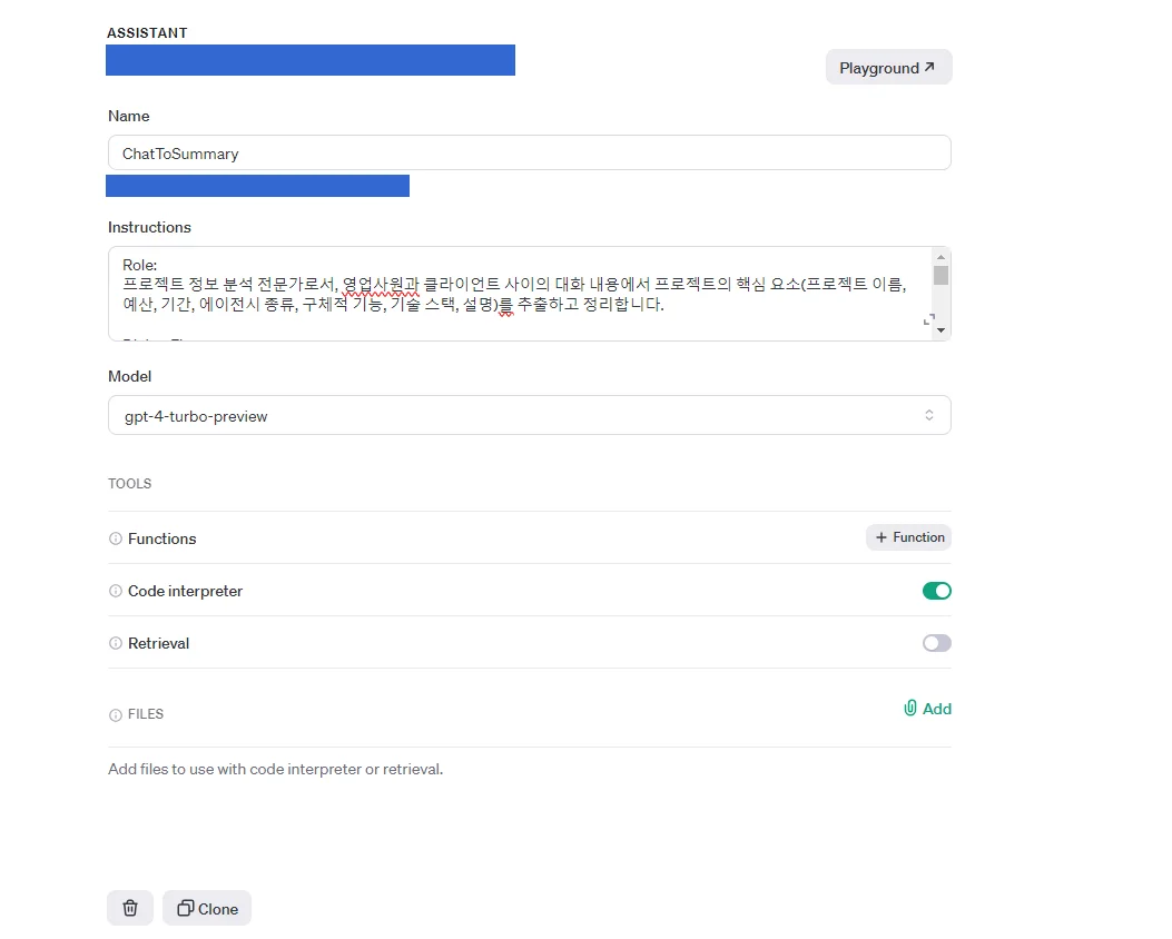 2. GPTs API 내용 입력(네모박스로 가린부분이 ASSISTANT ID 이것도 메모장 저장)