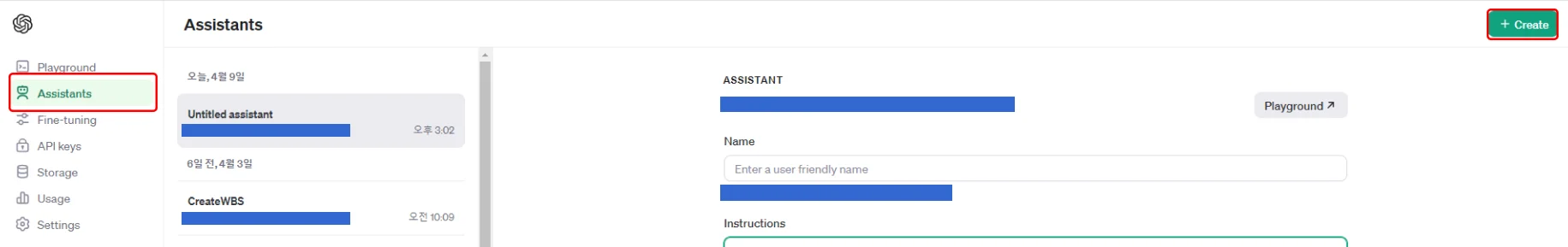 1. 왼쪽바에 Assistants 클릭 후 오른쪽 상단 +Create 클릭